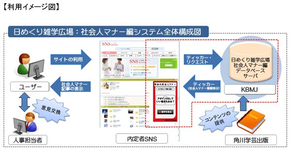 株式会社ケイビーエムジェイ(本社:東京都中央区、代表取締役社長:木村武弘 以下、KBMJ)は、株式会社角川学芸出版(本社:東京都文京区、代表取締役社長:青木誠一郎 以下、角川学芸出版)の持つ書籍を利用したWEBサイトコンテンツ配信サービス『日めくり雑学広場:社会人マナー編』の販売を開始いたしましたので、下記の通りご報告いたします。