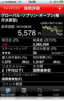 この総合金融情報配信iPhoneアプリは、iPhone 携帯端末を通して、国内追加型公募株式投信約 3,000 銘柄、国内株式約 3,800 銘柄、国内上場投信(ETF)約 100 銘柄の情報等が閲覧でき、9月7日より提供を開始いたしました。