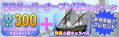 新サーバー「マゼラン」オープンを記念して、キャンペーン期間中に「黄金航路」を新規でスタートすると、ゲームを有利に進める事ができる「300海神」と「快速小型キャラベル1隻」をプレゼントいたします。