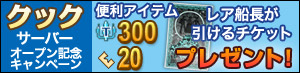2012年4月5日(木)12:59まで、新サーバー「クック」のオープンを記念したキャンペーンを実施いたします。「黄金航路」を初めてプレイされる方や既にプレイされている方など全ての方にお得なキャンペーンになっております。是非ご利用ください。