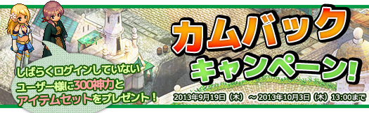 大型アップデートを記念して、しばらくセブンフィールズにログインしていない皆様のお帰りを歓迎する「カムバックキャンペーン」を実施いたします。2013年8月19日(月)以降にログインをしていないアカウントに対して、課金ポイントである300神力と下記のアイテムセットをプレゼントいたします。 ・旅のしおり×1 30日間、登録したポイントまで自由にワープする事ができるようになります。 ・傭兵召喚券×1 ランダムで特別な傭兵を仲間にする事ができます。 ・緑の薬×5 戦闘でのアイテムドロップ率がアップする魔法の薬です。 |