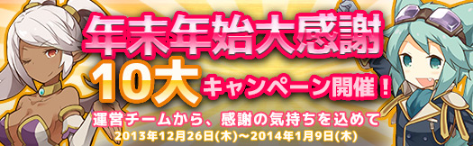 2013年、セブンフィールズをプレイして下さった皆様へ、感謝の気持ちを込めて、年末年始大感謝10大キャンペーンを実施いたします。本キャンペーンでは、課金ポイント購入時の付与ポイント1.2 倍やSR傭兵ユニット出現確率2倍、お得なアイテムセット販売など、大変お得なキャンペーンとなっております。是非ご利用下さい。