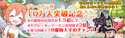 株式会社アピリッツ(本社:東京都渋谷区、代表取締役社長:三原順、以下アピリッツ)は、サービス中のWebブラウザゲーム「アルフヘイムの魔物使い」において、プレイヤー数が10万人を突破した事を記念して、大変お得なキャンペーンを実施する事をお知らせいたします。