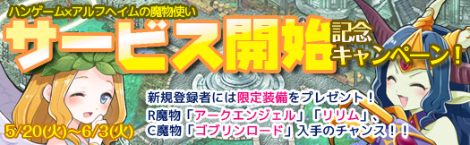 株式会社アピリッツ(本社:東京都渋谷区、代表取締役社長:和田順児、以下アピリッツ)は、NHN PlayArt株式会社(本社:東京都渋谷区、代表取締役社長:加藤雅樹、以下NHN PlayArt)が運営するインターネットゲームポータルサイト「ハンゲーム(URL:http://www.hangame.co.jp/ )」にて、ブラウザゲーム「アルフヘイムの魔物使い」のチャネリングサービスを2014年5月20日より開始することをお知らせします。また、同時にチャネリングサービスの開始を記念するキャンペーンを実施いたします。