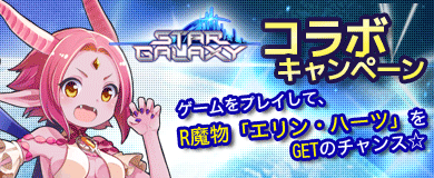 キャンペーン期間中、「スターギャラクシー」ゲームアカウントを新規で取得し、プレイヤーレベルを15以上にしたユーザーを対象として、「アルフヘイムの魔物使い」内で使用できる「スターギャラクシー」人気キャラクター「エリン・ハーツ」をモチーフとした限定Rサキュバスをプレゼントいたします。