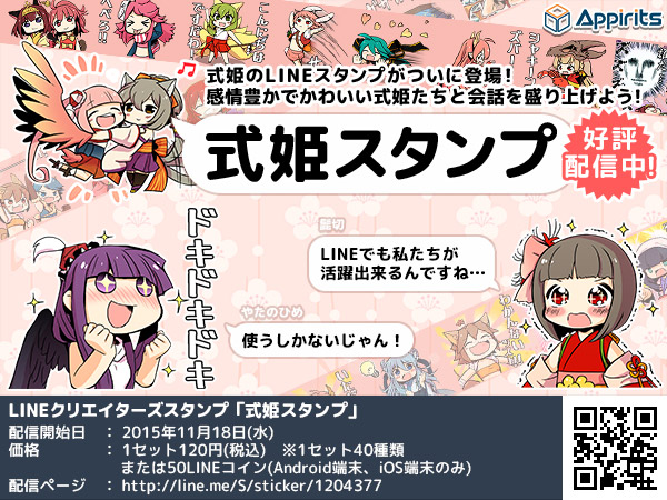 LINE株式会社(本社:東京都渋谷区、代表取締役社長:森川亮)が運営する「LINE STORE」の「クリエイターズスタンプ」にて、2015年11月18日(水)より「式姫スタンプ」の配信を開始いたしました。