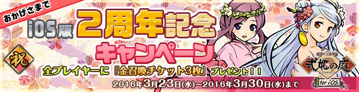 2016年3月23日(水)17:00以前にプレイヤーを作成した全プレイヤーに対して、超強力な式姫を召喚できる「金召喚チケット」を3枚プレゼントいたします。