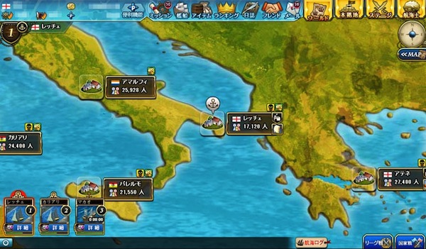 世界をめぐり交易品を売買することで資金を貯め、艦船の強化や街への投資を行う事ができます。また、交易路によって風向きが変化したり、全プレイヤーの取引量に連動して相場が変動するなど、非常に変化の富んだ貿易ができます。