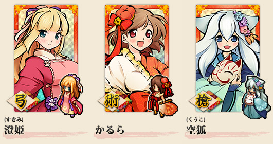 ※特別な「膝丸」「かるら」「空狐」はキャンペーン限定の特別版の式姫で、通常版とは札イラストおよび庭に出した時のアニメーションが異なります。