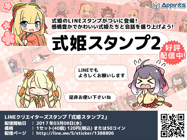 株式会社アピリッツ(本社:東京都渋谷区、代表取締役社長:和田順児、以下アピリッツ)は、サービス中のWebブラウザゲーム「かくりよの門」、「式姫の庭」、「式姫草子」及びスマートフォン向けゲーム『うつしよの帳』に登場するキャラクター「式姫」を使用したLINEクリエイターズスタンプ「式姫スタンプ2」を、2017年3月8日(水)より配信開始することを発表いたします。