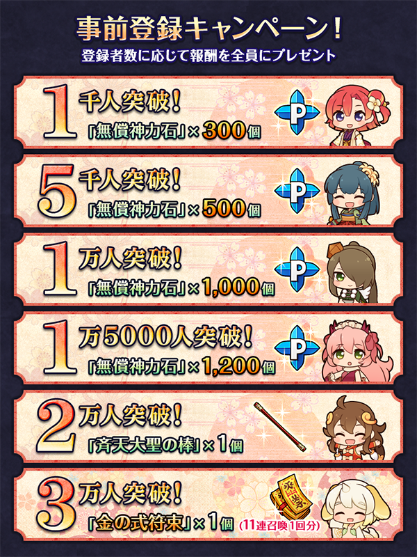 事前登録数に応じて、ゲーム内で使用できる有料ポイント「神力石」や金の式符召喚(11連召喚1回分)など豪華特典をご用意しております。
