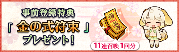 事前登録特典としてゲーム内のガチャ機能「金の式符召喚」に利用できる「金の式符束(11連ガチャ1回分)」などが、全ユーザーにプレゼントされます。