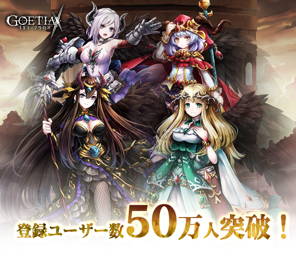 株式会社アピリッツ(本社:東京都渋谷区、代表取締役社長:和田順児、以下アピリッツ)は、2018年9月27日にサービスを開始した最新作のスマートフォン向けゲーム『ゴエティアクロス』の登録ユーザーが50万人を突破したことをお知らせ致します。