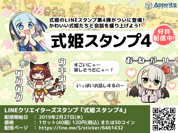 株式会社アピリッツ(本社:東京都渋谷区、代表取締役社長:和田順児、以下アピリッツ)は、Webブラウザゲーム『かくりよの門』『式姫の庭』及びスマートフォン向けゲーム『ひねもす式姫』に登場するキャラクター「式姫」を使用したLINEクリエイターズスタンプ「式姫スタンプ4」を、2019年2月27日(水)より配信開始することを発表いたします。