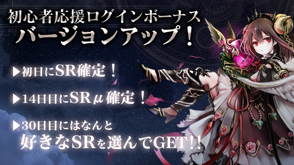 既存の初心者応援ログインボーナスと同じく「SR魔神召喚の供物」に加えて、14日目には「新規14日記念SRμ7PUの供物」、