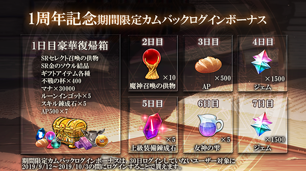 1日目には「1周年記念置物」10日目には「SR魔神召喚の供物」をご用意していますので、
