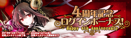2020年1月7日(火)定期メンテナンス開始前までの期間中、4周年を記念した特別なログインボーナスが追加されます。