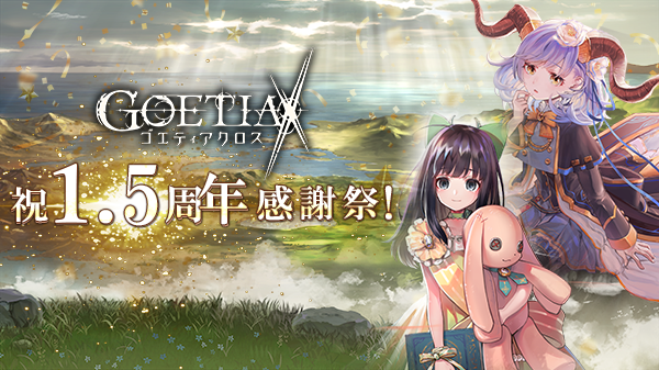 株式会社アピリッツ(本社:東京都渋谷区、代表取締役社長:和田順児、以下アピリッツ)にて現在サービス中のスマートフォンアプリ・ブラウザゲーム『ゴエティアクロス』は、2020年3月27日にサービス開始1.5周年を迎えました。支えてくださっているユーザーの皆様へ感謝の気持ちを込めて、「1.5周年キャンペーン」を開催いたします!