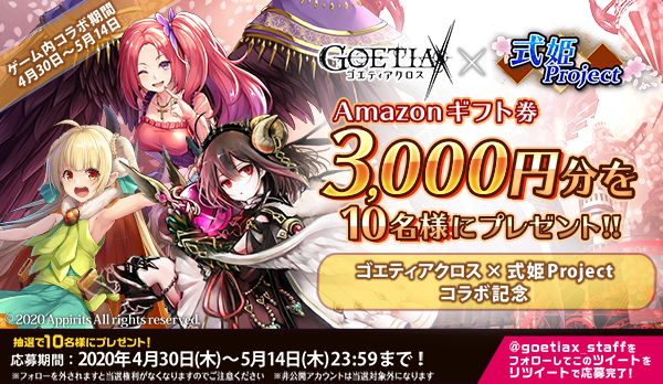 株式会社アピリッツ(本社:東京都渋谷区、代表取締役社長:和田順児、以下アピリッツ)は、現在サービス中のスマートフォンアプリ・ブラウザゲーム『ゴエティアクロス』にて、『式姫Project』とのコラボイベントを2020年4月30日(木)より開始したことをお知らせいたします。また、ゴールデンウィーク中に『ゴエティアクロス』を目いっぱい楽しんで頂けるキャンペーンも開催いたします。