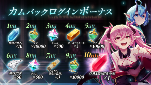 さらに期間中10日間ログインすると「SR確定魔物召喚石・紅」することができます。