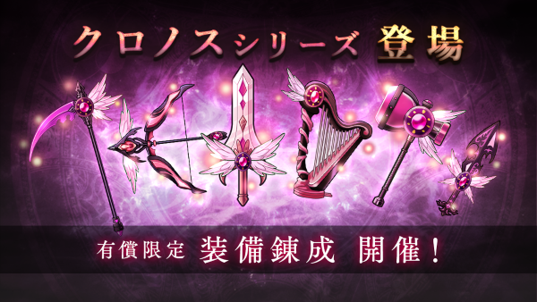 新たに追加されたSR装備「クロノスシリーズ」を含む、SR以上の装備のみが出現する有償ジェム錬成を開催中です。