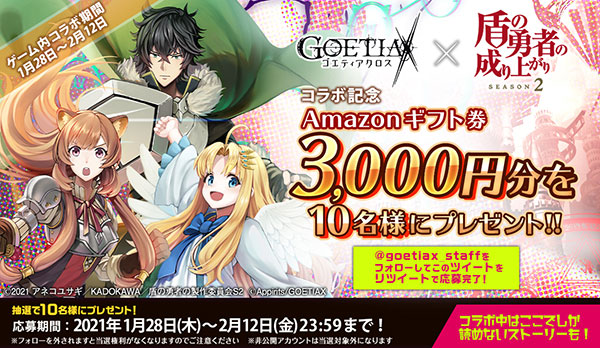 TVアニメ『盾の勇者の成り上がり Season 2』とのコラボを記念し、Amazonギフト券3,000円分を10名様にプレゼントいたします。