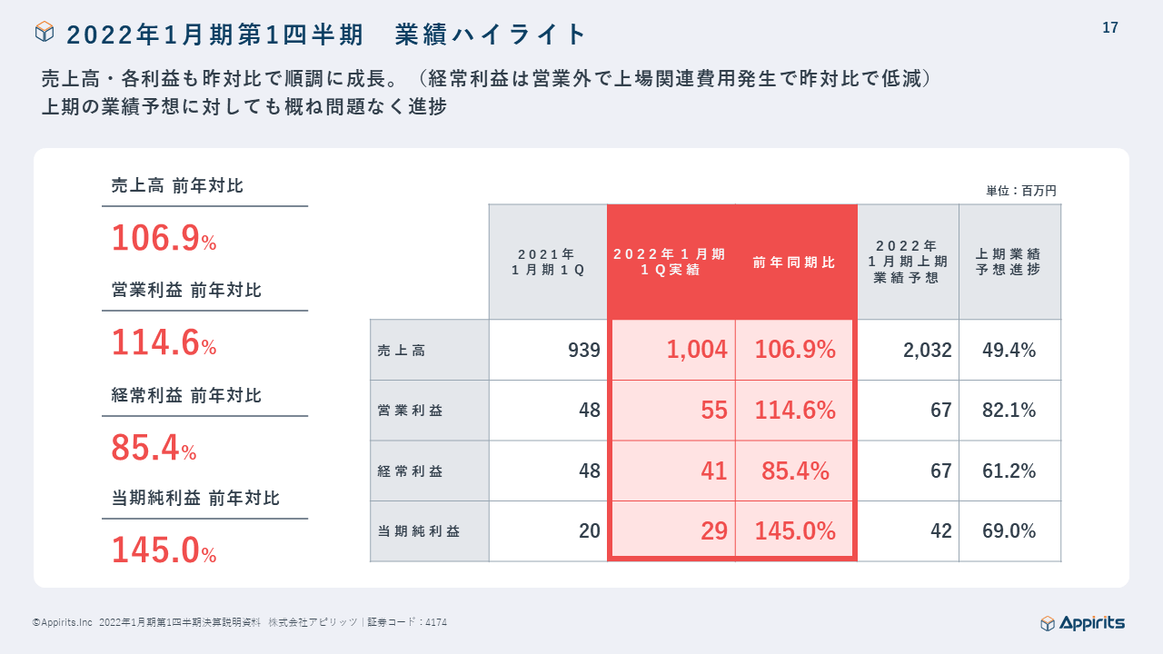 2022年1月期第1四半期 業績ハイライト(決算資料一部抜粋)