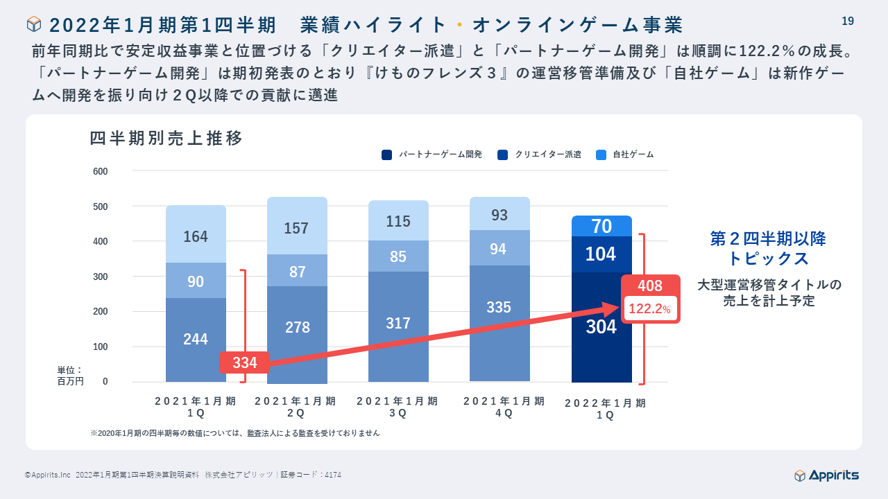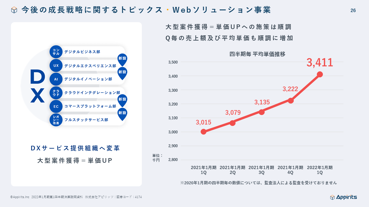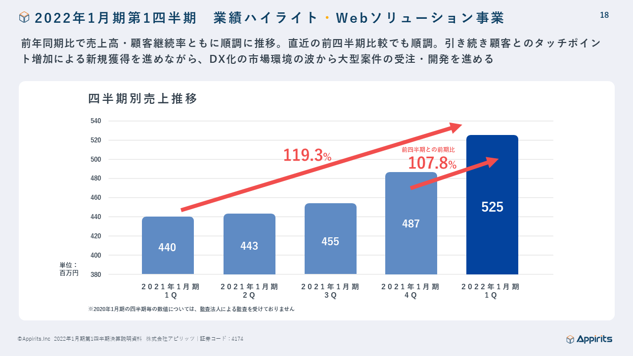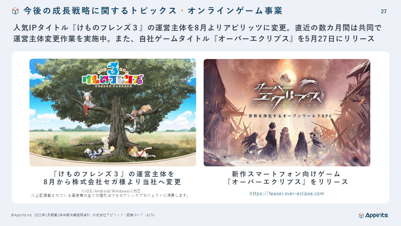 このような状況の中ではありますが、顧客のデジタル・トランスフォーメーションにおけるデジタル化への流れが引き続き力強く、当社の主力事業であるWebソリューション事業及びオンラインゲーム事業は2021年3月17日に発表している2022年1月期の業績予想に対して堅調に推移致しました。詳細は決算短信及び決算説明会資料をご参照ください。
