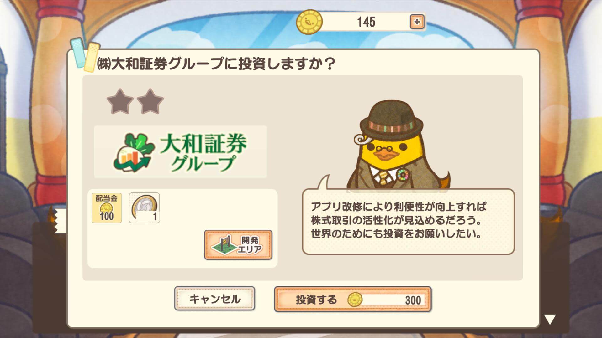 株式市場からの資金調達により、会社が投資を続け社会が支えられている。そんな複雑な仕組を、アプリゲームを通して簡単に伝えたいと大和証券グループ社長は考えるが、ゲーム開発と運営には大金が必要であることを知る。そこで出資を依頼された投資家社長は、「世の中をよくするための啓蒙ゲーム」製作に共感し、ひと羽脱ぐことを決意する。
