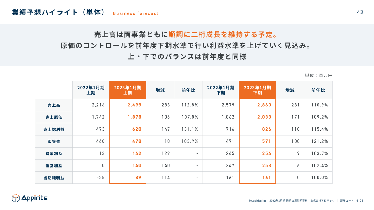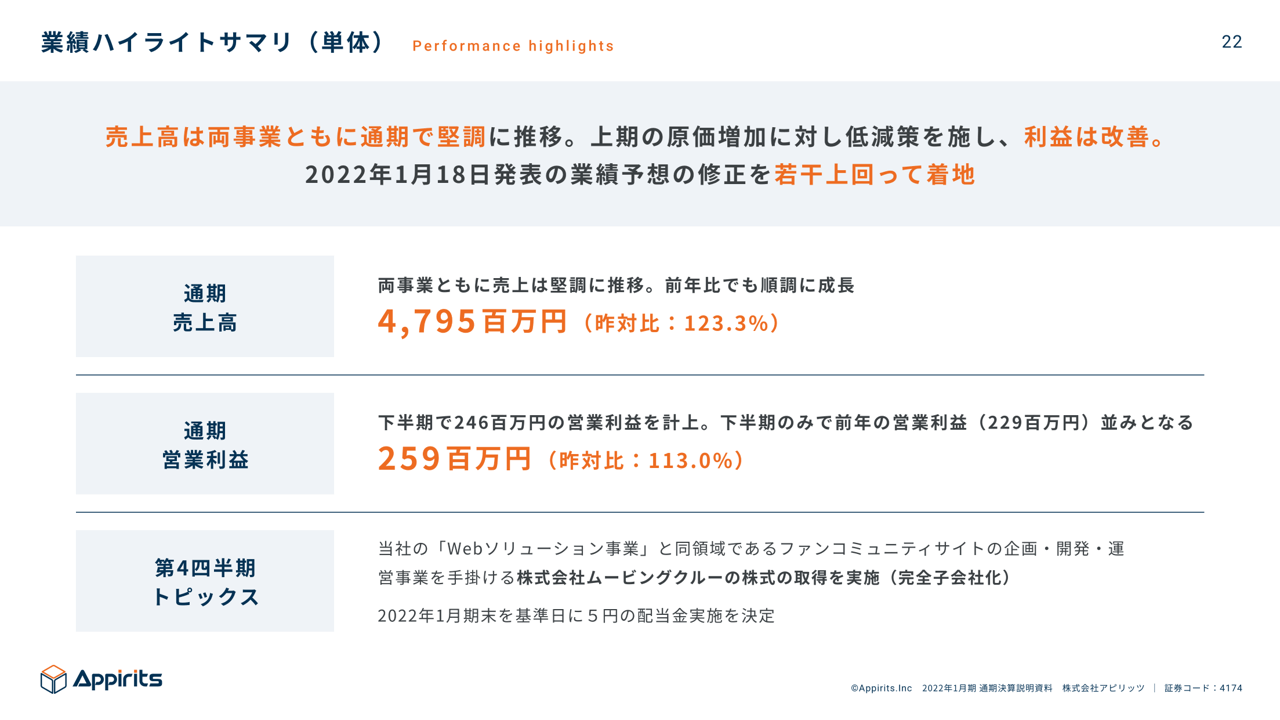 2022年1月期通期 単体 業績ハイライト(決算説明資料一部抜粋)