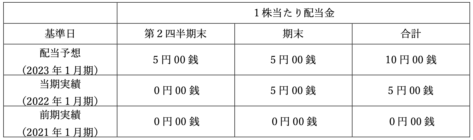 「2023年1月期の配当額について1株当り中間配当5円、期末配当金5円、合計10円を目指すことを決議いたしましたので、2023年1月期配当予想を下記の通りお知らせいたします。