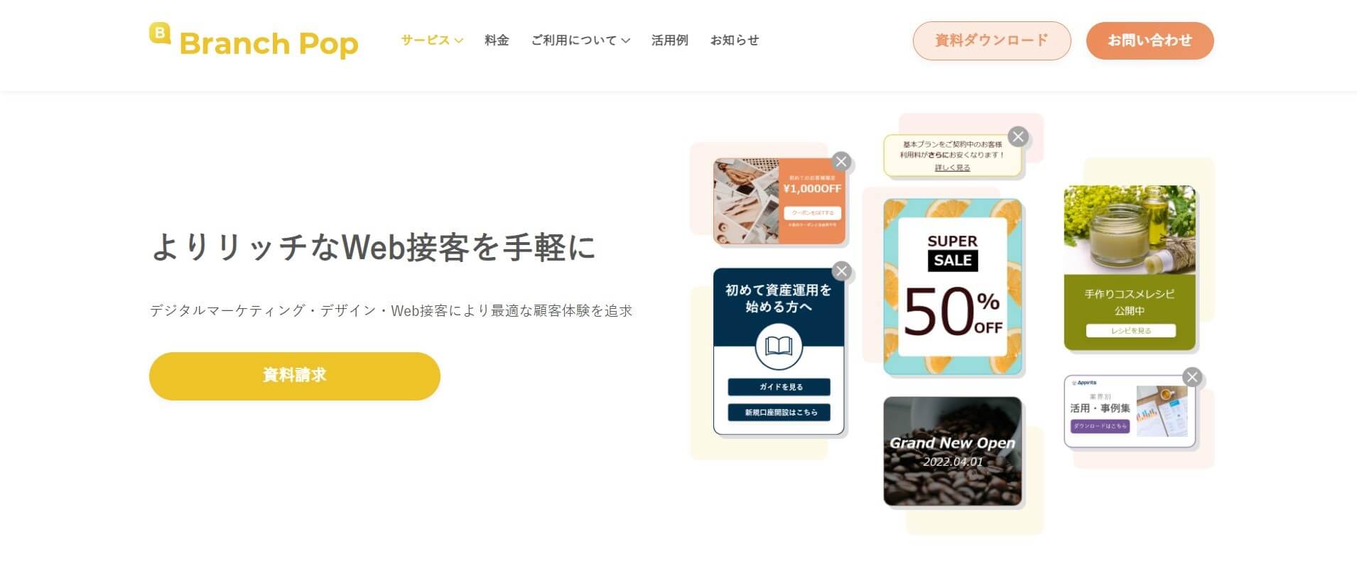 「Branch Pop」は、人・場所・時間などを起点とした多種多様なポップアップで、ユーザー1人1人の活性化を目的としたWeb接客ツールです。