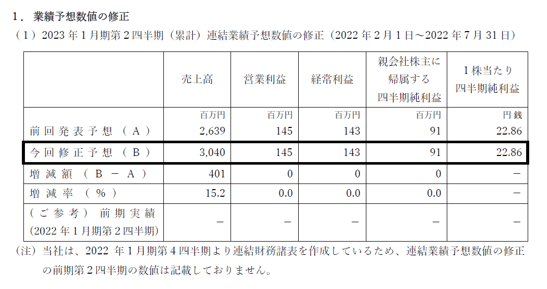 2023年1月期 第2四半期累計期間及び通期業績予想の修正のお知らせ。