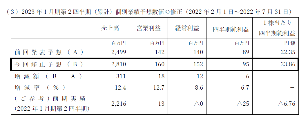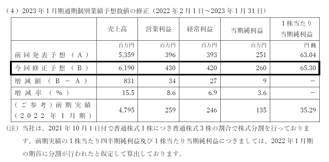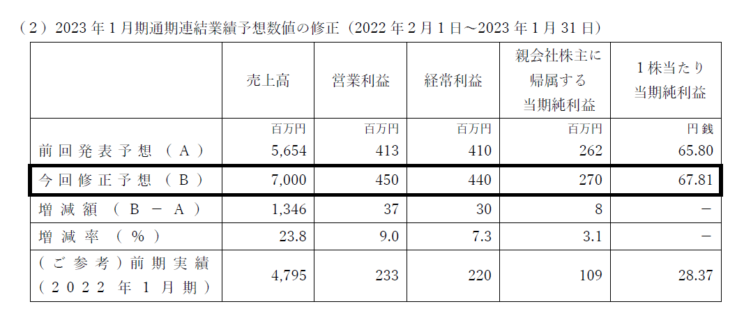 その結果、営業利益等が2022年3月16日に公表した2023年1月期第2四半期累計期間及び通期の連結・個別の業績予想を上回る見込みとなり、このたび修正いたしました。