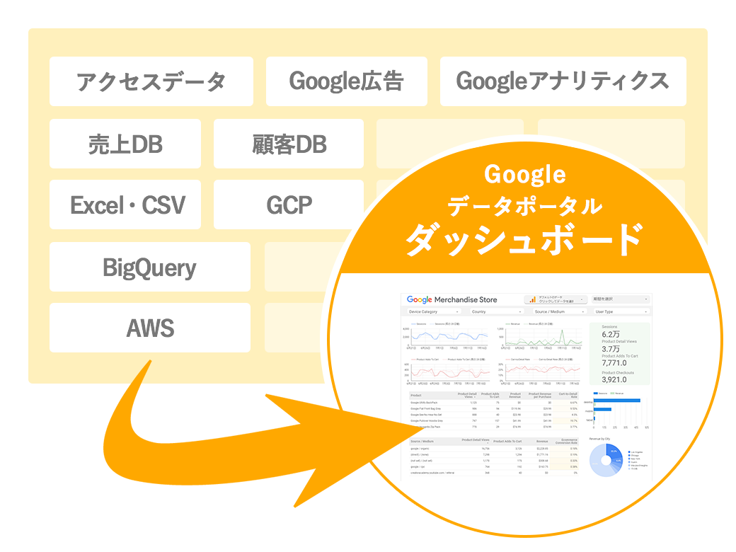 アピリッツでは、必要なデータを抽出できるGoogleが提供するBIツール「Googleデータポータル」を使用し設計・設定を行い膨大なデータの一元化を行います。