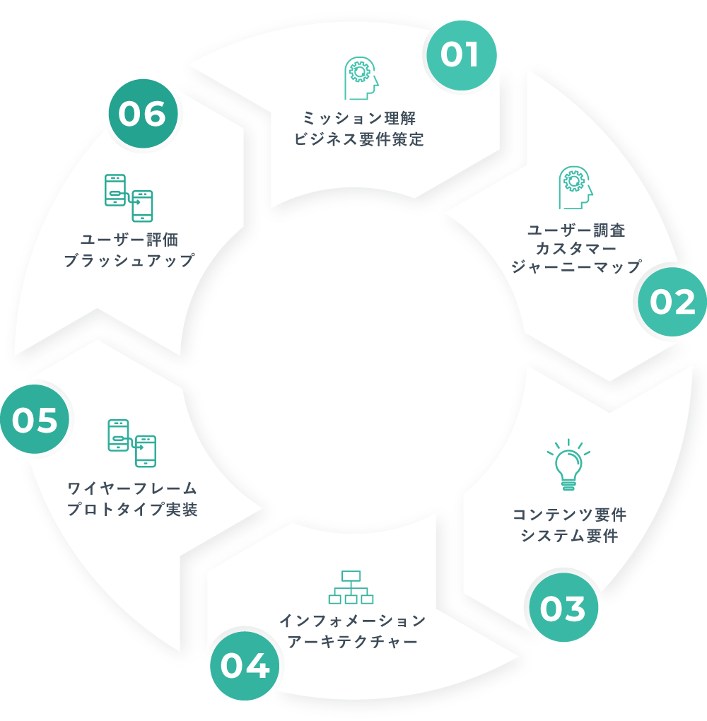 UXデザインを戦略策定・要件策定・構造設計・骨格設計・表層制作の5つのフェーズに分けて進行します。
